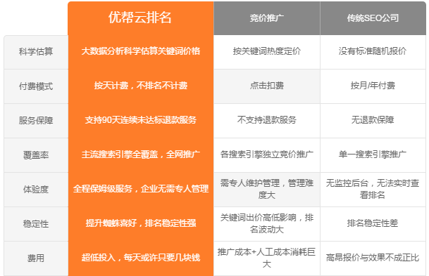 优帮云是一家专业做SEO和网站建设的服务商,为个人开发者用户、中小型、大型数字营销企业用户提供一站式营销推广、网站优化、网站建设,优化团队拥有十来年的搜索引擎优化经验,优化技术优良且更新算法符合2019年搜索引擎,SEO技术超越国内优化同行。优帮云是国内为数不多具有自主核心技术的云数字营销服务商,以精湛的技术,为大中小型企业提供周全的优化服务。